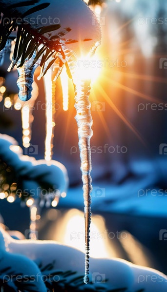 Сосульки свисают с вечнозеленых ветвей, отражая теплые лучи солнца. Река течет спокойно, окруженная прекрасным зимним пейзажем, когда день превращается в ночь. Ранняя весна в лесу. Генеративный ИИ