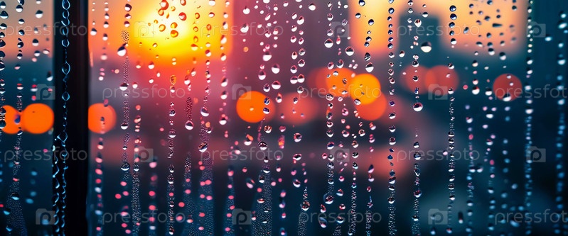 Капли дождя цепляются за оконное стекло, образуя замысловатые узоры, отражая мягкий свет заката. Теплые цвета смешиваются, создавая безмятежную атмосферу во время дождливого вечера. Генеративный ИИ