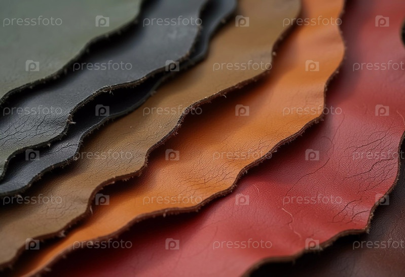 Образцы натуральной коровьей кожи разных цветов аккуратно разложены на поверхности, демонстрируя уникальные текстуры и качества каждого изделия. Эта коллекция подчеркивает мастерство. Генеративный ИИ