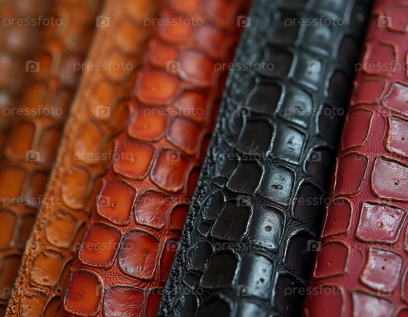 Различные образцы натуральной крокодиловой кожи представлены в ярких цветах. Каждый экземпляр демонстрирует уникальные текстуры и отделки, привлекательные для любителей кожи и дизайнеров. Генеративный ИИ