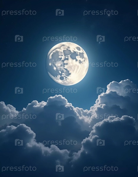 Светящаяся луна висит в темном небе, окруженная мягкими облаками, которые создают мечтательную атмосферу. Сцена приглашает к тихим моментам размышлений и удивления под звездами. Генеративный ИИ