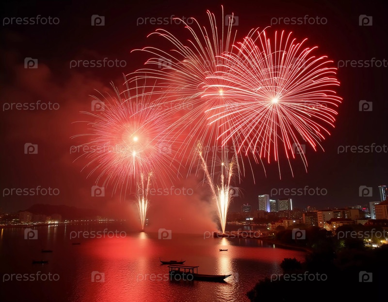Яркие красные и золотые фейерверки взрываются на фоне темного неба, отражаясь в водном пути. Празднование освещает городской горизонт во время праздничного ночного мероприятия. Генеративный ИИ