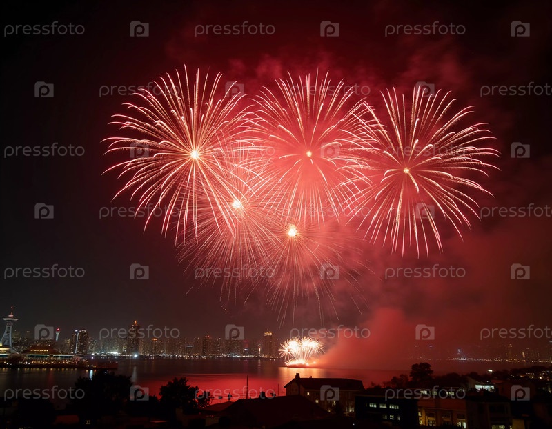 Яркие красные и золотые фейерверки взрываются на фоне темного неба, отражаясь в водном пути. Празднование освещает городской горизонт во время праздничного ночного мероприятия. Генеративный ИИ