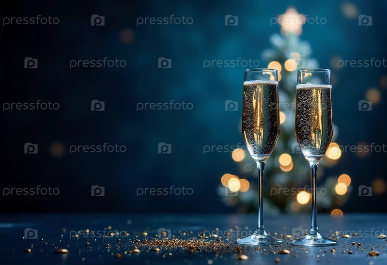 Два сверкающих бокала шампанского элегантно стоят на фоне украшенной рождественской елки, передавая дух праздника золотым мерцанием. Генеративный ИИ