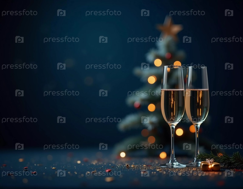 Два сверкающих бокала шампанского элегантно стоят на фоне украшенной рождественской елки, передавая дух праздника золотым мерцанием. Генеративный ИИ