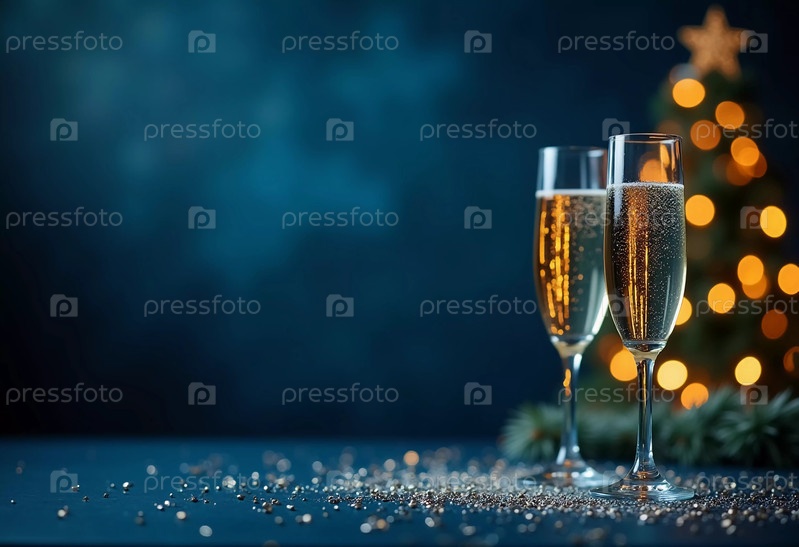 Два сверкающих бокала шампанского элегантно стоят на фоне украшенной рождественской елки, передавая дух праздника золотым мерцанием. Генеративный ИИ