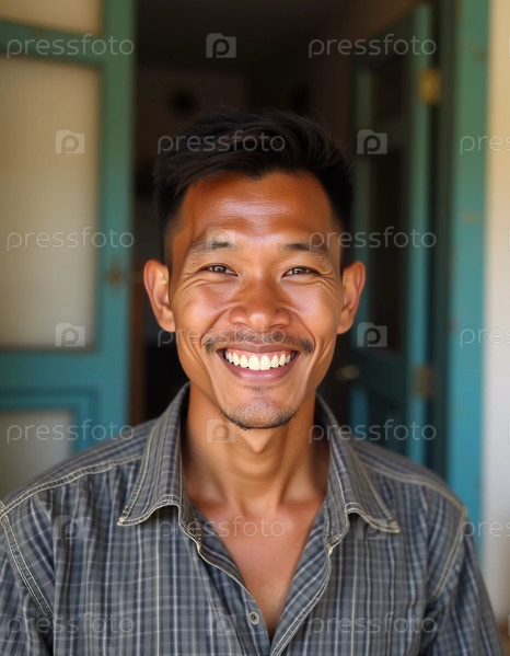 Радостный житель Таиланда сияет от счастья, стоя у входа в традиционный деревянный дом. Его дружелюбная улыбка отражает теплоту местной культуры и гостеприимство. Генеративный ИИ