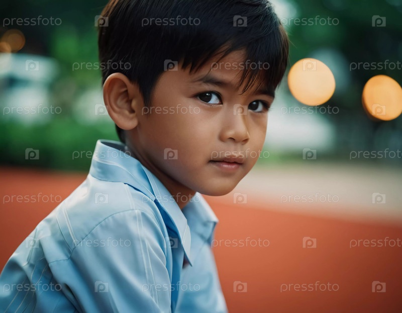 Мальчик в Таиланде задумчиво смотрит вдаль, одетый в светло-голубую рубашку. Мягкий вечерний свет создает безмятежную атмосферу, подчеркивая его любопытное выражение и окружающую обстановку. Генеративный ИИ