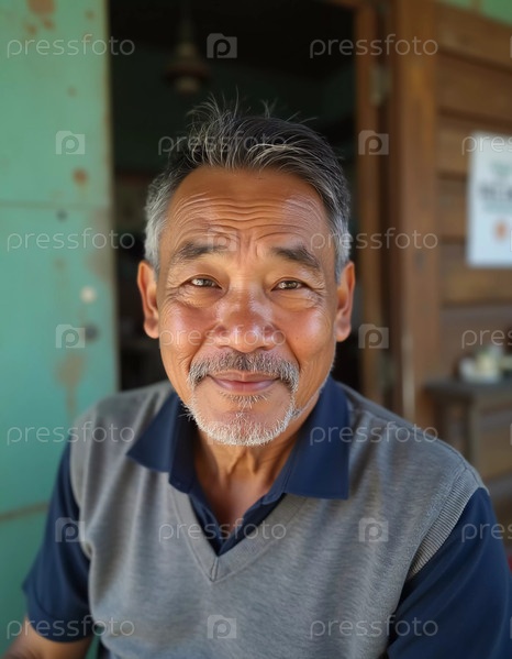Пожилой мужчина с теплой улыбкой и седыми волосами удобно сидит возле деревенского деревянного здания в Таиланде. Его расслабленное поведение отражает местную культуру и гостеприимство. Генеративный ИИ