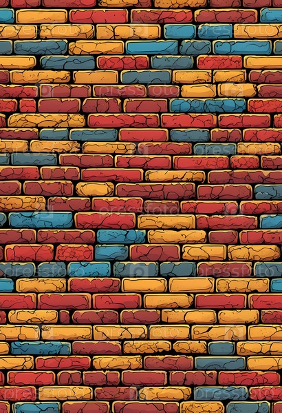 Эта яркая кирпичная стена демонстрирует множество цветов, включая красный, желтый, бирюзовый и фиолетовый. Дизайн отражает художественный подход, часто встречающийся в городской среде. Генеративный ИИ