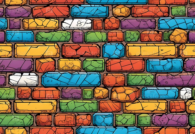 Эта яркая кирпичная стена демонстрирует множество цветов, включая красный, желтый, бирюзовый и фиолетовый. Дизайн отражает художественный подход, часто встречающийся в городской среде. Генеративный ИИ