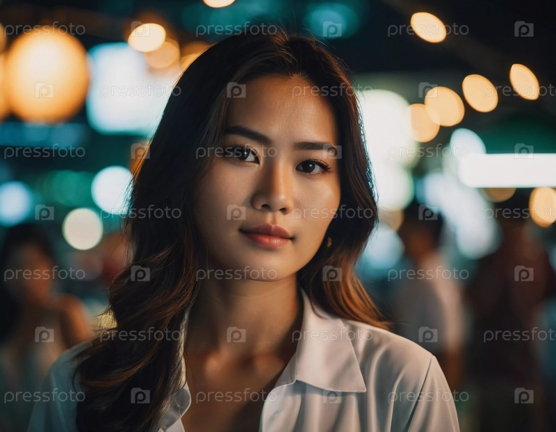 Жительница Таиланда уверенно стоит на оживленном ночном рынке, освещенном теплыми огнями. Ее спокойное выражение лица контрастирует с бурлящей энергией вокруг нее