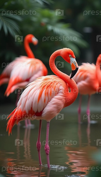 Фламинго собираются в тихом пруду, их оранжевые перья отражаются в воде. Они игриво взаимодействуют, создавая потрясающее зрелище природы. Фламинго Phoenicopterus — род птиц. Генеративный ИИ