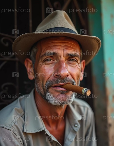 Пожилой мужчина с седыми волосами и густой бородой широко улыбается, держа сигару в зубах. Он отдыхает в своем районе на Кубе, наслаждаясь моментом. Генеративный ИИ
