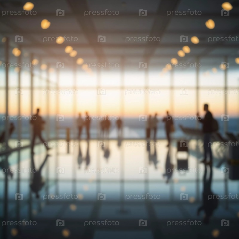 Толпы путешественников перемещаются по просторному терминалу аэропорта, занимаясь различными делами и готовясь к предстоящим рейсам в утреннем или вечернем свете. Расфокусированное боке. Генеративный ИИ