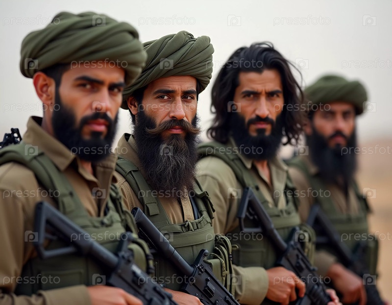 Группа вооруженных мужчин, одетых в традиционную одежду, стоит сплоченно, демонстрируя товарищество и готовность. Воинствующие мусульмане, похожие на Талибан или пакистанскую армию. Густая борода. Генеративный ИИ
