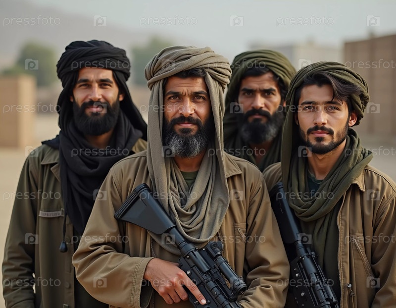 Группа вооруженных мужчин, одетых в традиционную одежду, стоит сплоченно, демонстрируя товарищество и готовность. Воинствующие мусульмане, похожие на Талибан или пакистанскую армию. Густая борода. Генеративный ИИ