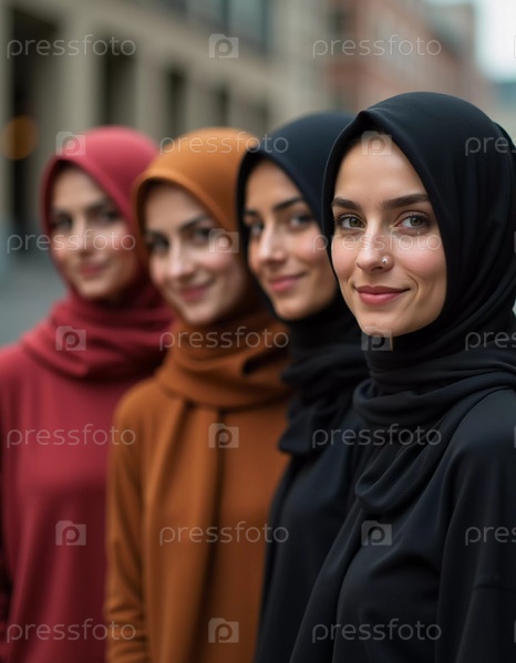 Разнообразная группа мусульманских женщин в красочных хиджабах уверенно стоит вместе. Они делятся улыбками и товариществом, наслаждаясь моментом единения и счастья. Красивые молодые женщины. Генеративный ИИ