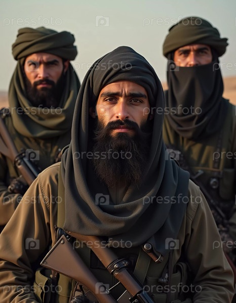 Группа вооруженных мужчин, одетых в традиционную одежду, стоит сплоченно, демонстрируя товарищество и готовность. Воинствующие мусульмане, похожие на Талибан или пакистанскую армию. Густая борода. Генеративный ИИ