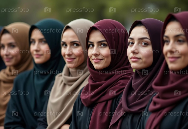 Разнообразная группа мусульманских женщин в красочных хиджабах уверенно стоит вместе. Они делятся улыбками и товариществом, наслаждаясь моментом единения и счастья. Красивые молодые женщины. Генеративный ИИ