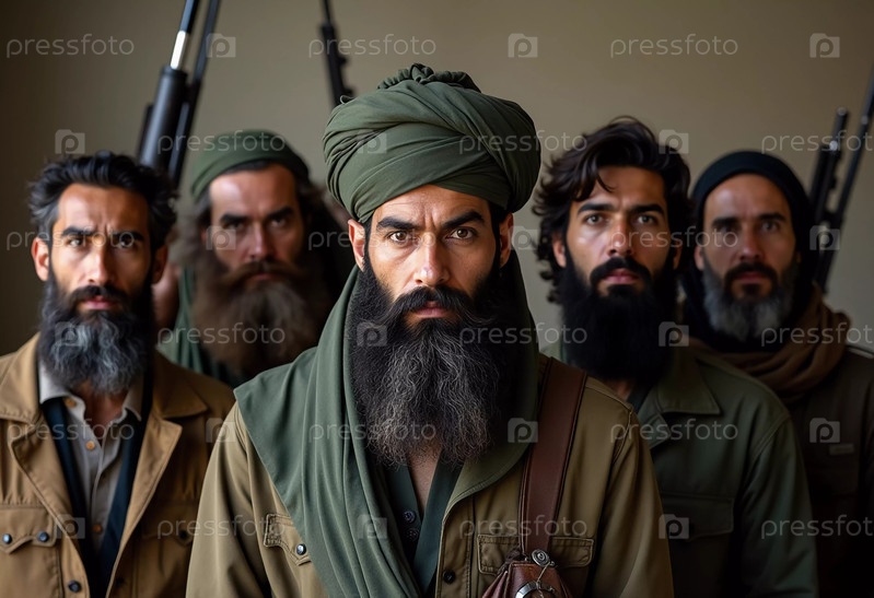 Группа вооруженных мужчин, одетых в традиционную одежду, стоит сплоченно, демонстрируя товарищество и готовность. Воинствующие мусульмане, похожие на Талибан или пакистанскую армию. Густая борода. Генеративный ИИ
