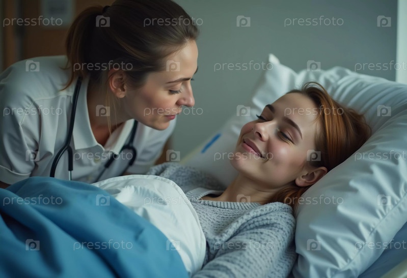 Врач наклоняется вперед, чтобы утешить улыбающуюся женщину на больничной койке, создавая момент надежды и связи на фоне ее полного трудностей пути к выздоровлению. Генеративный ИИ