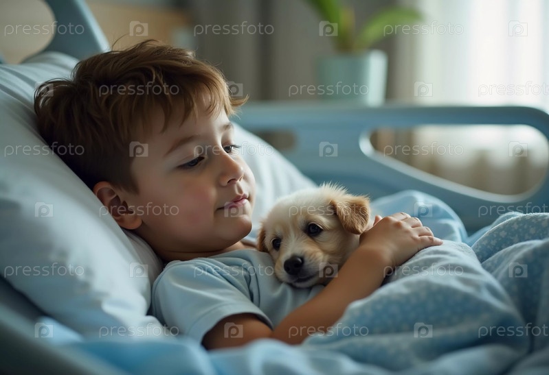 Мальчик, отдыхающий на больничной койке, обнимает маленького щенка. Их связь приносит чувство комфорта и надежды среди трудностей болезни и выздоровления. Генеративный ИИ