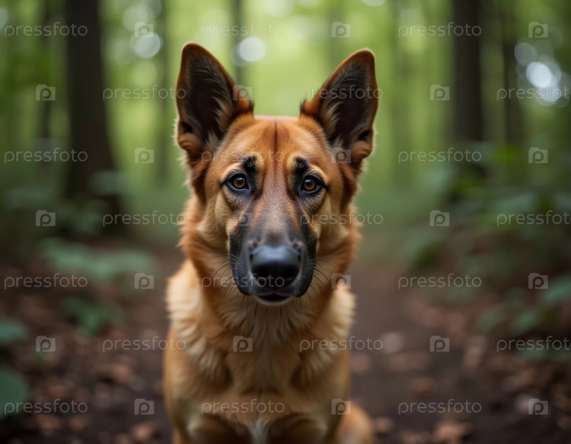 В тихом лесу собака внимательно смотрит на зрителя, окруженная высокими деревьями и пятнистым солнечным светом, пробивающимся сквозь листву. Выражение собаки показывает любопытство и связь AI