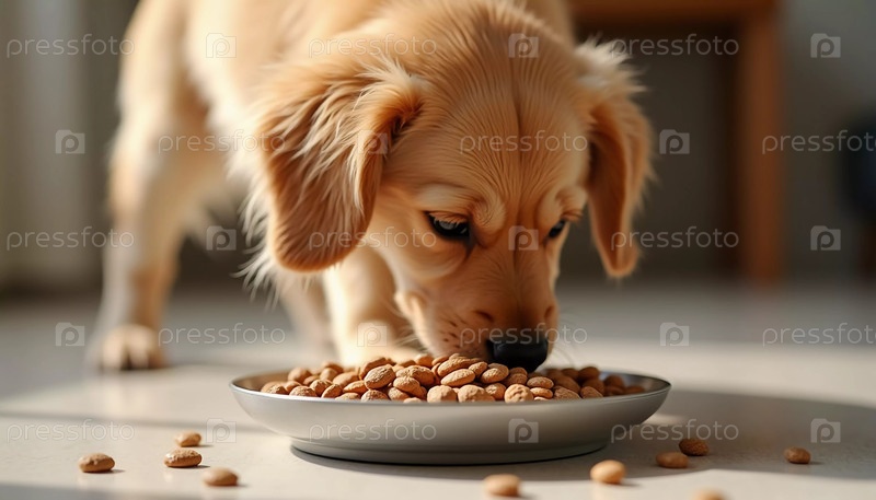 В теплом и гостеприимном доме игривый золотистый щенок деликатно ест сухую еду из серебряной миски. Солнечный свет проникает внутрь, освещая радостный момент и разбросанный корм вокруг AI