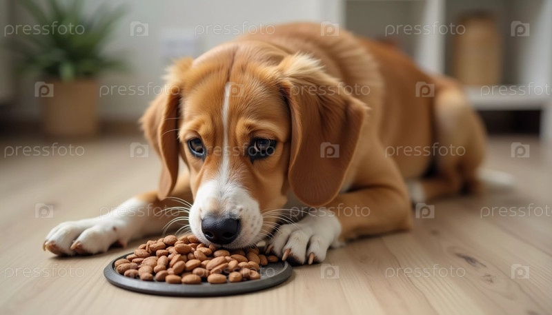 Веселая собака лежит на деревянном полу, ее лапа мягко покоится на металлической миске, наполненной сухим кормом AI