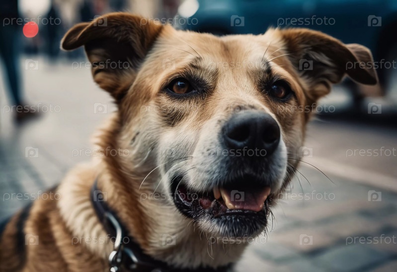 Веселая собака взаимодействует с людьми и окружением в оживленном городе. Живая атмосфера наполнена активностью, когда солнце светит вниз, освещая игривый дух собаки AI