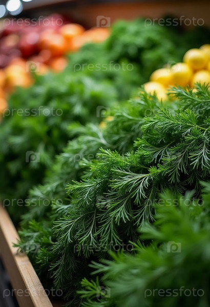 Свежая зелень укропа элегантно разложена на деревянной подставке в окружении разнообразных красочных фруктов и овощей, ярко выделяющихся в полуденном свете супермаркета