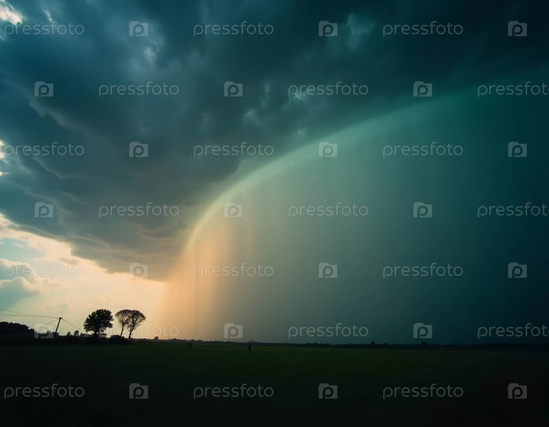 Темные и зловещие грозовые тучи собираются, создавая драматическую стену влаги на фоне красочного сумеречного неба. Пейзаж огромен, подчеркивая грубую силу приближающейся угрозы Генеративный ИИ