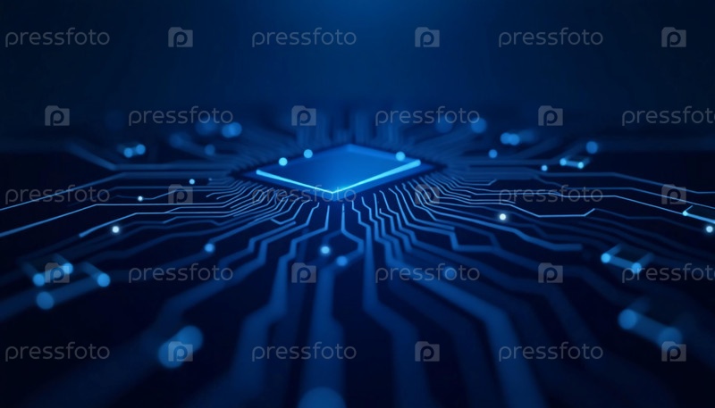 Глубоко в цифровом мире сложные схемы и светящиеся микрочипы объединяются, демонстрируя мощь искусственного интеллекта и технологий в ярких синих тонах. Генеративный ИИ