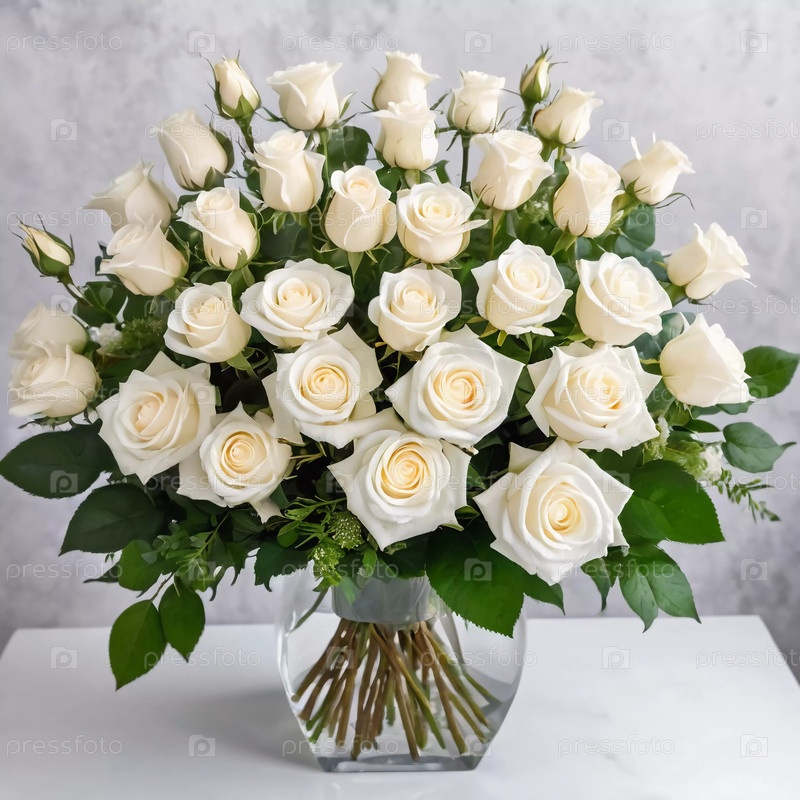 Потрясающая композиция из белых роз привлекает внимание своей изящной композицией. Букет, наполненный свежими цветами и богатой зеленой листвой, излучает спокойствие. Генеративный искусственный интеллект