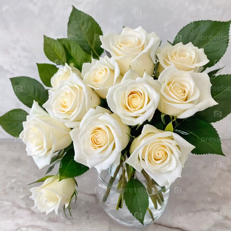 Пышные белые розы с нежно-желтыми серединками изящно собраны в прозрачную вазу, создавая умиротворяющий и умиротворяющий центр внимания, идеально подходящий для любой элегантной обстановки. Генеративный искусственный интеллект