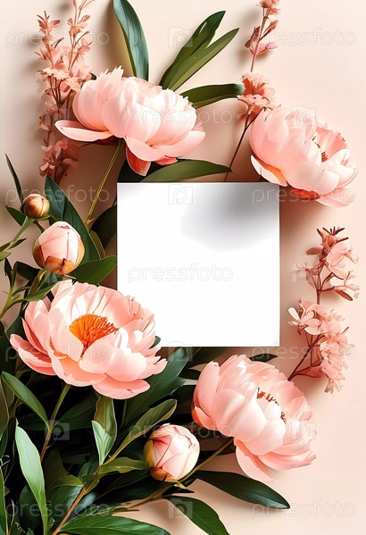 Нежные розовые пионы и мягкая зелень обрамляют прекрасное пустое пространство, идеально подходящее для личных заметок или художественных проектов, излучая элегантность и очарование