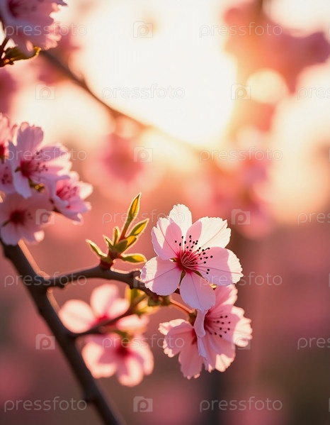 На рассвете мягкий солнечный свет проникает сквозь нежные цветы сакуры, освещая их нежные розовые оттенки. Воздух наполнен сладким ароматом весны, а ветви слегка покачиваются на теплом ветру. Медоносные пчелы порхают от цветка к цветку, собирая нектар, в