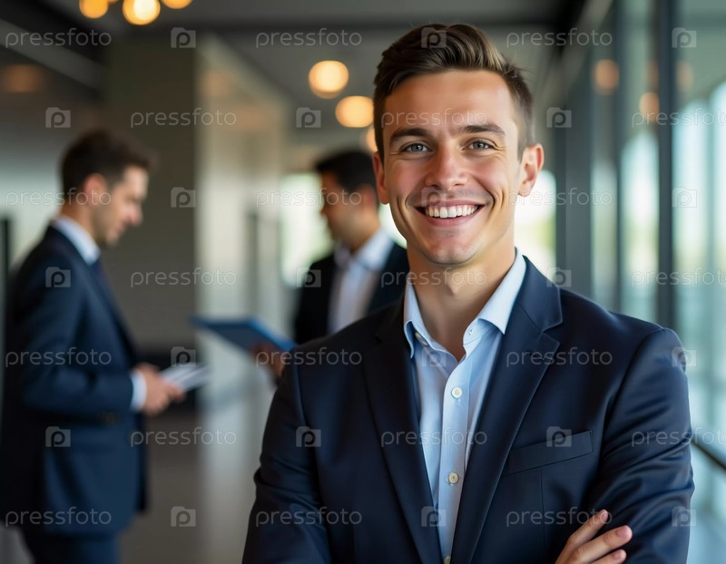 Яркий солнечный свет проникает сквозь большие окна офиса, освещая уверенного в себе мужчину в деловом костюме Генеративный искусственный интеллект