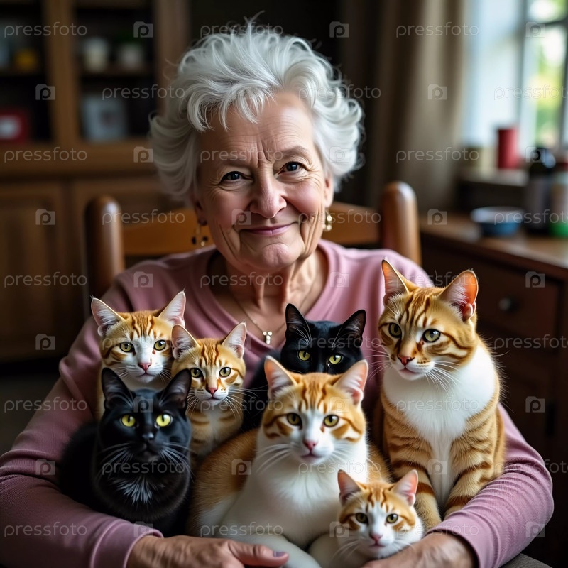 Веселая пожилая женщина расположилась в кресле, а вокруг нее — семь игривых кошек. Генеративный ИИ
