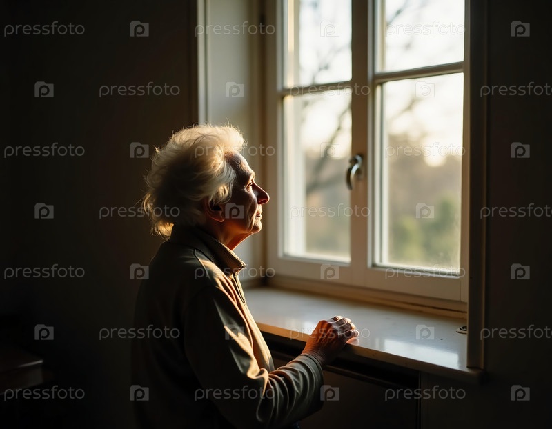 С мягким золотистым светом, льющимся через окно, пожилая женщина стоит, погруженная в свои мысли. Она смотрит наружу, возможно, вспоминая прошлое или размышляя о предстоящем дне. Генеративный ИИ