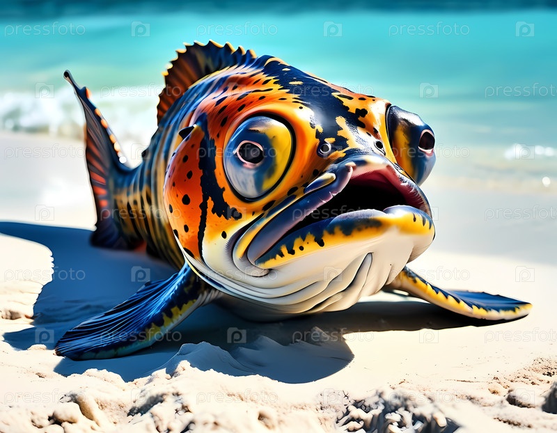 Яркая рыба с причудливой окраской лежит на теплом песке, греясь на солнце, а вдалеке видны мягкие океанские волны, что создает спокойную прибрежную атмосферу