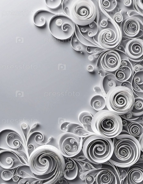 Бумажные цветы, выполненные в технике квиллинга. Цветы в оттенках серого и белого расположены по кругу на сером фоне. Рамка с местом для копирования. Сгенерировано с помощью ИИ