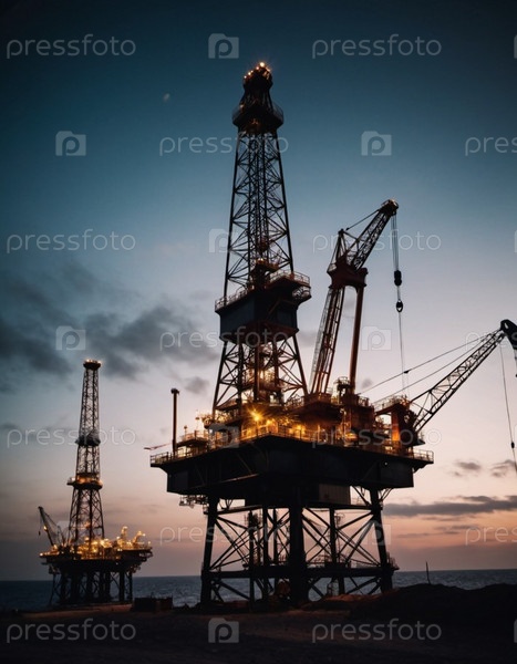 Большая, освещенная морская нефтяная вышка возвышается в воде в сумерках. Огни вышки отбрасывают теплый свет на темнеющее небо, а силуэт платформы обрамлен рябью воды. AI