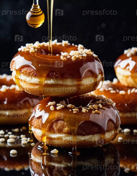 Стопка пончиков с медовой глазурью и глянцевой карамельной глазурью, украшенных хрустящей начинкой, приглашает вас побаловать себя сладким лакомством. Эти пончики идеально подойдут любому любителю десертов. Генеративный ИИ
