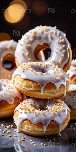 Вкусный ассортимент ванильных пончиков, покрытых кремовой глазурью и разноцветной посыпкой, демонстрирующих свою привлекательную текстуру и сладость в теплой обстановке кафе. Белая глазурь на булочках. Генеративный ИИ