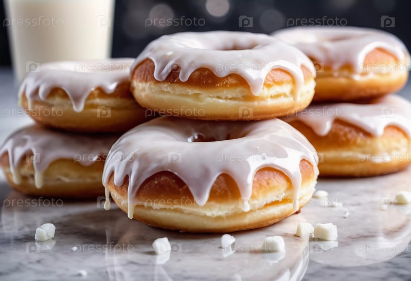Вкусный ассортимент ванильных пончиков, покрытых кремовой глазурью и разноцветной посыпкой, демонстрирующих свою привлекательную текстуру и сладость в теплой обстановке кафе. Белая глазурь на булочках. Генеративный ИИ
