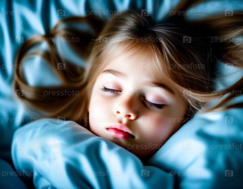 Мирная молодая девушка крепко спит в своей уютной постели, окруженная мягкими синими одеялами. Ее длинные ресницы нежно покоятся на ее щеках. Мягкие синие одеяла. Утренний свет. Безмятежное выражение. AI