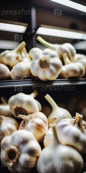 На прилавке супермаркета выложены свежие крупные головки чеснока, привлекательно разложенные, привлекающие покупателей своим ярким внешним видом и насыщенным ароматом. Покупатели ищут кулинарное вдохновение. Генеративный ИИ