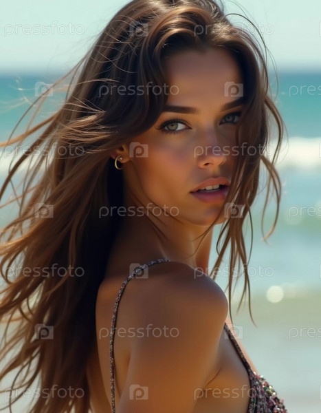 Брюнетка в купальнике смотрит назад, стоя у береговой линии. Нежные морские волны плещутся у ее ног под ясным голубым небом. Длинные волосы, красивое молодое лицо. Реклама путешествий и одежды. AI